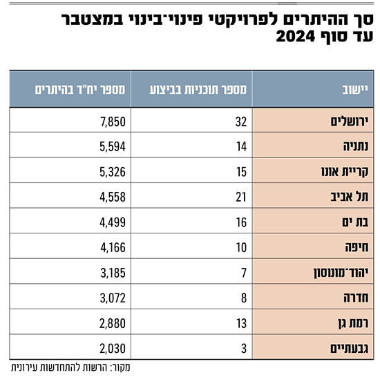 עוד על פי נתוני הרשות להתחדשות עירונית, עד סוף 2024 אושרו בגבעתיים 2,030 דירות בלבד בהתחדשות עירונית. אפילו בקרית אונו וביהוד, הקטנות מגבעתיים משמעותית מבחינת אוכלוסיה, אושרו יותר דירות. בקרית אונו אושרו 5,326 דירות בפינוי־בינוי, וביהוד אושרו 3,185 דירות.