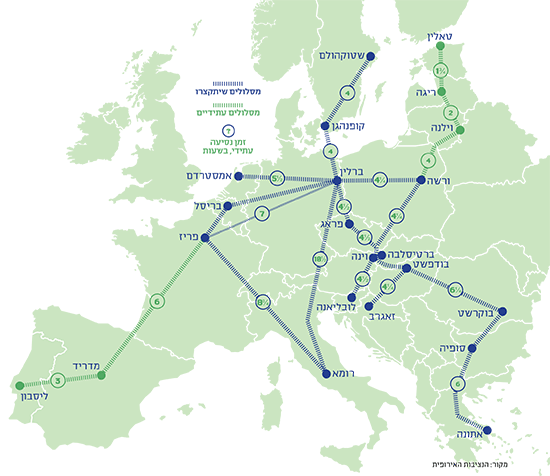 החודש פרסמה הנציבות האירופית תוכנית לרשת של רכבות מהירות שיחצו את היבשת ויחברו בין המדינות החברות באיחוד ב־2040, ממש מעבר לפינה. לפי התוכנית, ניתן יהיה לנסוע מפריז למדריד בשש שעות, מווינה לוורשה בארבע שעות וזהו גם הזמן שיארך מקופנהגן לברלין. אילוסטרציה מרשימה של רשת הרכבות המהירה המחודשת פורסמה גם היא, עם קווים אופקיים (סקנדינביה־איטליה) ואנכיים (צרפת־רומניה) והזמנים המתוכננים.