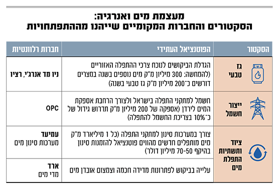 לדוגמה, ניו־מד אנרג'י המפעילה את מאגר הגז לוויתן ונהנית מחוזי יצוא לירדן ומצרים -צפויה לפוטנציאל של הרחבת האספקה לצורך התפלת מים, שטרם השפיע מהותית על הכנסותיה. גם יצרנית החשמל OPC עשויה להרוויח מכך שתחנות הכוח שלה נמצאות בלב שרשרת ההתפלה.