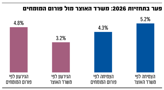 משרד האוצר מכוון לגירעון של 3.2% בשנת 2026, וצופה צמיחה של 5.2% באותה שנה. עם זאת, פורום המומחים שמייעץ למשרד הרבה פחות אופטימי. הפורום, הפועל באופן וולנטרי תחת אגף הכלכלן הראשי, כולל מומחים למאקרו־כלכלה מהמגזר העסקי והציבורי, ומטרתו היא לנהל דיונים על מצב המשק ומגמות עתידיות כחלק מעבודת החיזוי של האגף.