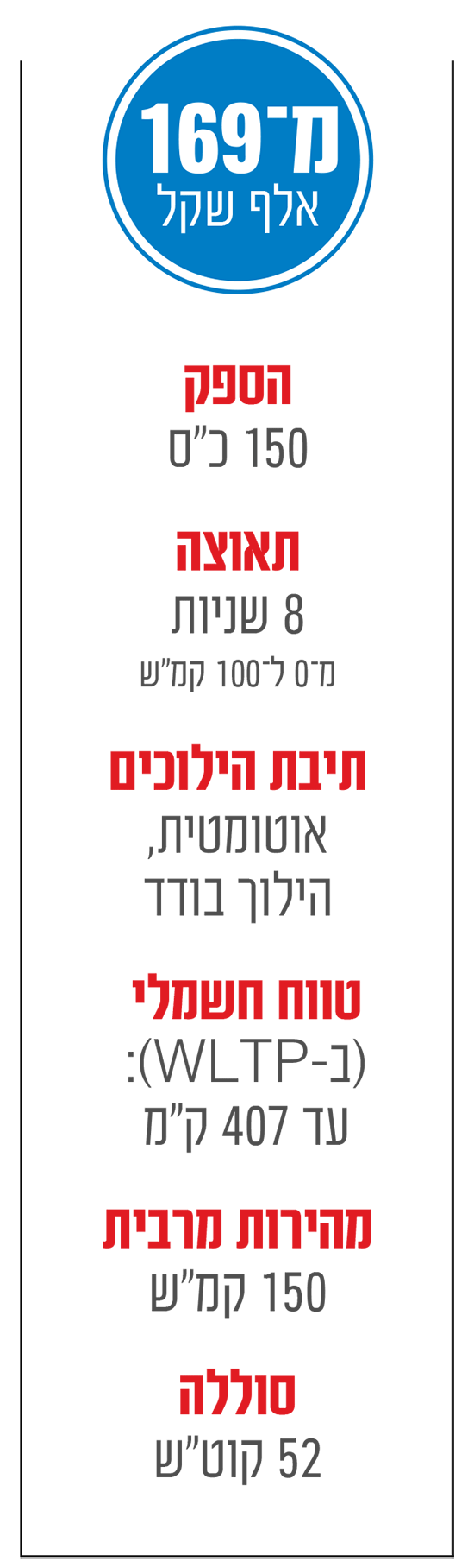 165 עד 170 אלף שקל, עיצוב עכשווי מאוד ותא נוסעים מרווח ומודרני. ממדיה גדולים יותר, ותא המטען בנפח 460 ליטר. מנוע בהספק 204 כ"ס וטווח עד 432 ק"מ