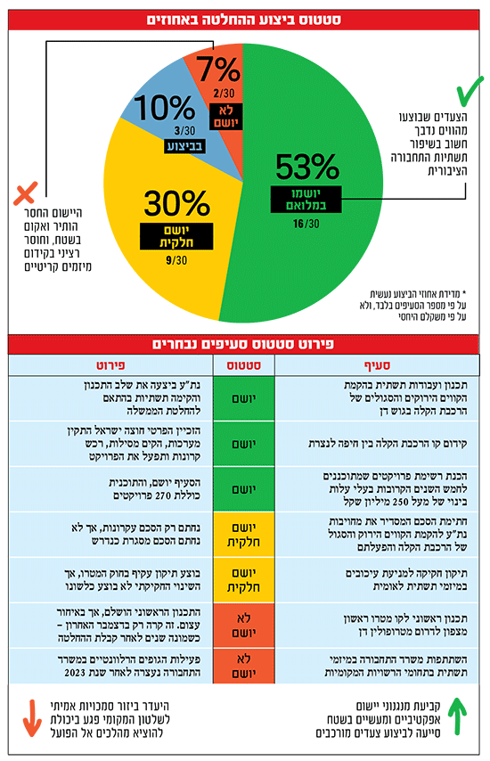 וזה ניכר בשטח. פרויקטים כמו המטרו בגוש דן, אשר תוכננו להביא לשיפור משמעותי בתחבורה הציבורית, מתעכבים בשלבי התכנון והאישור. בגוש דן נרשמו עיכובים ממושכים במינוי ראש רשות המטרו, באישור התוואי ובחקיקת תקיעת חוק המטרו שאמנם היה בשל לקריאה שנייה ושלישית אך לא קודם עקב נפילת הממשלה. עם הקמת הממשלה הנוכחית נדרשו הדיונים להתחיל מחדש, מה שדחה באופן ניכר את התקדמות הפרויקט וכך גם פרויקטים נוספים. למרות שהממשלה קיבלה החלטות המשך לקדם תשתיות תחבורה ציבורית, המחסור בתשתיות ניכר ומורגש, בין היתר, בשל הליכי תכנון ממושכים ואי מימוש החלטות.