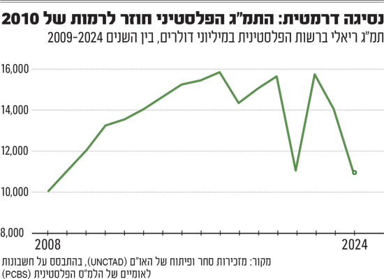 לפי נתונים של מזכירות הסחר והפיתוח של האו"ם (UNCTA), כלכלת יהודה ושומרון הצטמצמה ב־2024 ב־17% - ירידה של כ־18.8% בתמ"ג לנפש - מה שמחק 17 שנות פיתוח ודחק את הכלכלה לרמות 2014 ואת התמ"ג לנפש לרמות 2008. הנתונים משקפים את הנזק המצטבר מפעילות טרור לאורך שנים: לפי הארגון, ללא המגבלות שהוטלו מאז האינתיפאדה השנייה בשנת 2000, הכלכלה הפלסטינית הייתה מייצרת תמ"ג מצטבר נוסף של 170.7 מיליארד דולר - פי 17 מהתמ"ג של יהודה ושומרון בשנה שעברה.