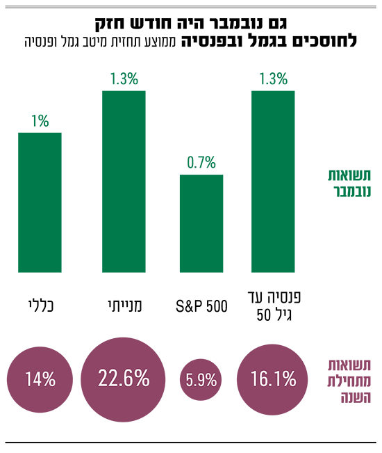 באשר לחודש נובמבר עצמו, ברקוביץ מעריך כי התשואה החודשית במסלולים הכלליים של קופות הגמל תעמוד על 1% (עם טווח רחב של 0.5% עד 1.3%). במסלולים המנייתיים המנעד רחב עוד יותר. התשואה הממוצעת היא 1.3% אבל הטווח נע מ־0.7% ועד 1.8% - פער של יותר מפי 2. גם בקרנות הפנסיה לגילאי 50 ומטה צפויה להירשם תשואה חודשית של 1.3% עם טווח רחב.