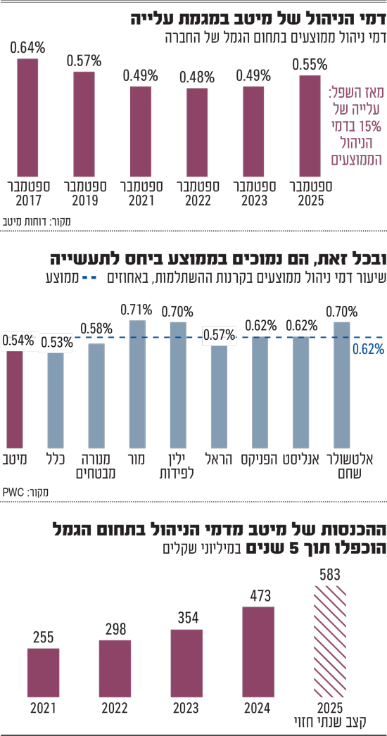 כשמסתכלים על המספר הכולל, דמי הניהול בפעילות הגמל של מיטב זינקו מ־255 מיליון שקל בשנת 2021 עד ל־437 מיליון שקל בתשעת החודשים הראשונים של שנת 2025 (כלומר קצב שנתי של 583 מיליון שקל בשנה).