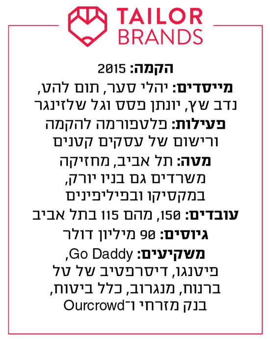 חדר זכוכית אטום לרעש במשרדי הסטארט־אפ טיילור ברנדס (Tailor Brands) בשדרות רוטשילד בתל אביב יושב המנכ"ל והמייסד יהלי סער. במסדרון בחוץ מתנגן סט של מוזיקה אלקטרונית, שעה שהעובדים - רובם צעירים בגילי ה־20 וה־30 המוקדמים - נהנים מהפי האוור, שכולל עוגיות שמנמנות ומשקאות מאצ'ה קרים.