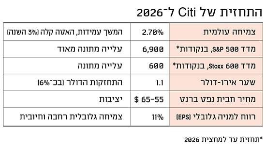 בענקית ההשקעות Citi צופים שמגמת הצמיחה העולמית תימשך גם ב־2026, בקצב של 2.7%. כותרת התחזית היא "ביצועי 'זהבה ושלושת הדובים', אך הסיכונים נותרים בעינם". הכוונה היא לדייסה בסיפור, לא חמה מדי ולא קרה מדי: "אופטימיות עשויה להיות מילה חזקה מדי, אך אנו לפחות מרגישים מידה של נוחות לגבי התחזית ל־2026, בניגוד מוחלט להערכות הקודרות יותר שלנו מהשנים האחרונות", כתבו.