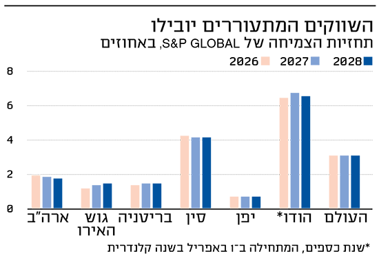 1השווקים המתעוררים יובילו: ב־S&P צופים כי השווקים המתעוררים יתרמו כשני שליש מצמיחת התמ"ג העולמית ב־2026. הצמיחה המשמעותית ביותר, 6.5%-7.0%, צפויה בהודו, שם הביקוש המקומי היציב ירכך את ההאטה ביצוא כתוצאה ממכסים. הרגיעה במלחמת הסחר עם ארה"ב צפויה לתמוך בצמיחה בסין, שתשוב ותעלה ל־4.5%. הגידול בהוצאות על ביטחון ותשתיות, במיוחד בגרמניה, יתרום להאצה בצמיחה האירופית ל־1.5% עד 2028. הירידה במחירי הנפט מתמרצת את הכלכלה העולמית, מגדילה את ההכנסה הפנויה ומעודדת את ההוצאה הצרכנית.