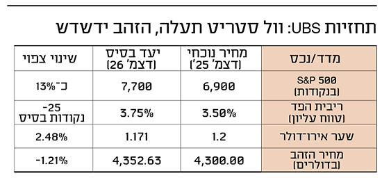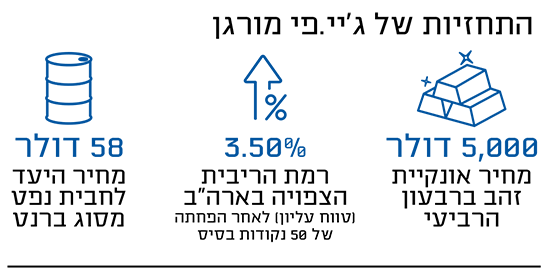 5מחיר הזהב יגיע ל־5,000 דולר לאונקייה: מחלקת המחקר נותרת "שורית" לגבי הזהב, על רקע הגברת הרכישות מצד בנקים מרכזיים וביקוש חזק מצד משקיעים. להערכתם, מחירי הזהב צפויים לזנק ל־5,000 דולר לאונקיה עד הרבעון הרביעי של 2026, ולעמוד על ממוצע של 4,753 דולר לאורך השנה. בנוגע לנפט, הצפי הוא שלא נראה תנודות משמעותיות ביחס למחירו הנוכחי. התחזית היא ל־58 דולר לחבית מסוג ברנט.