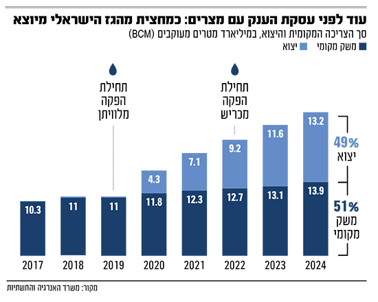 מנתוני משרד האנרגיה עולה, כי אשתקד ישראל ייצאה 13.2 BCM, והפיקה 13.9 BCM למשק המקומי. להשוואה, ב־2020 היה היחס 4.3 BCM ליצוא ו־11.8 BCM למשק המקומי. הגורם לאותו זינוק ביצוא הוא מצרים, שהתחילה לייבא גז טבעי מישראל ב־2020 עם כמות של 2.2 BCM, שצמחה באופן עקבי, כולל במלחמה, עד ל־10 BCM ב־2024.