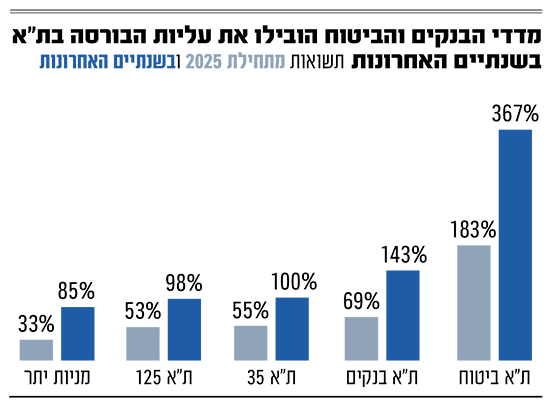בשנתיים האחרונות המדדים המובילים בבורסה הניבו תשואה מצטברת של 100%, כאשר 2025 הייתה פנומנלית במיוחד. במהלכה מדדי ת"א 35 ו-125 השיאו כ-55%, והבורסה שברה שיאים יותר מ-60 פעמים במהלך השנה.