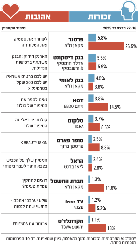 המשרדים האחראים לשלוש הפרסומות האהובות ביותר הם מקאן ת"א (פרטנר), גיתם BBDO (הוט) ויהושע TBWA (מקדונלדס)