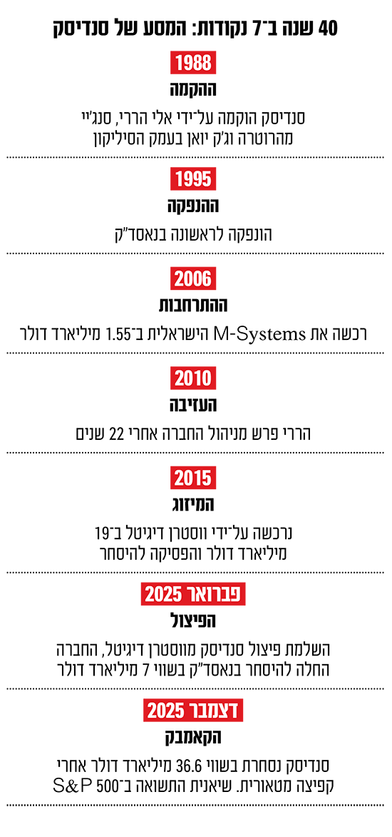 כך למשל הרבעון שהסתיים בספטמבר 2025, הסתכם בסנדיסק עם צמיחה של 23% בהכנסות לרמה של 2.3 מיליארד דולר ומעבר מתזרים שלילי של 131 מיליון דולר מפעילות שוטפת לתזרים חיובי בגובה 488 מיליון דולר.