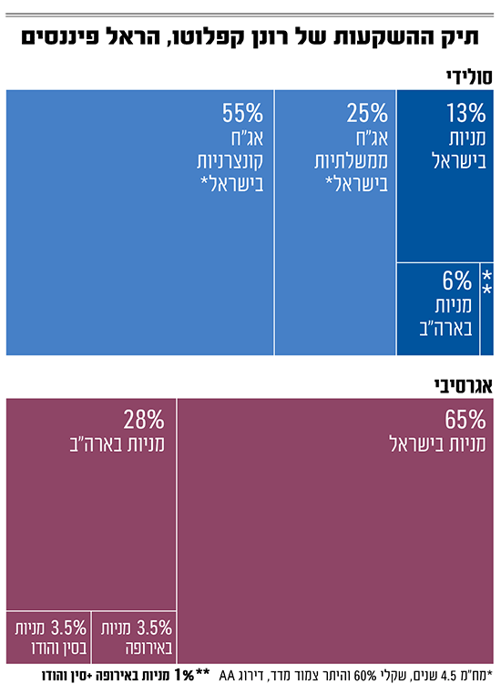 כשאנחנו מבקשים ממנו תיק למשקיע אגרסיבי, קפלוטו הולך על תיק מנייתי שמורכב מ־65% מניות בישראל, 28% מניות בארה"ב, ועוד 3.5% באירופה ו־3.5% בסין ובהודו.