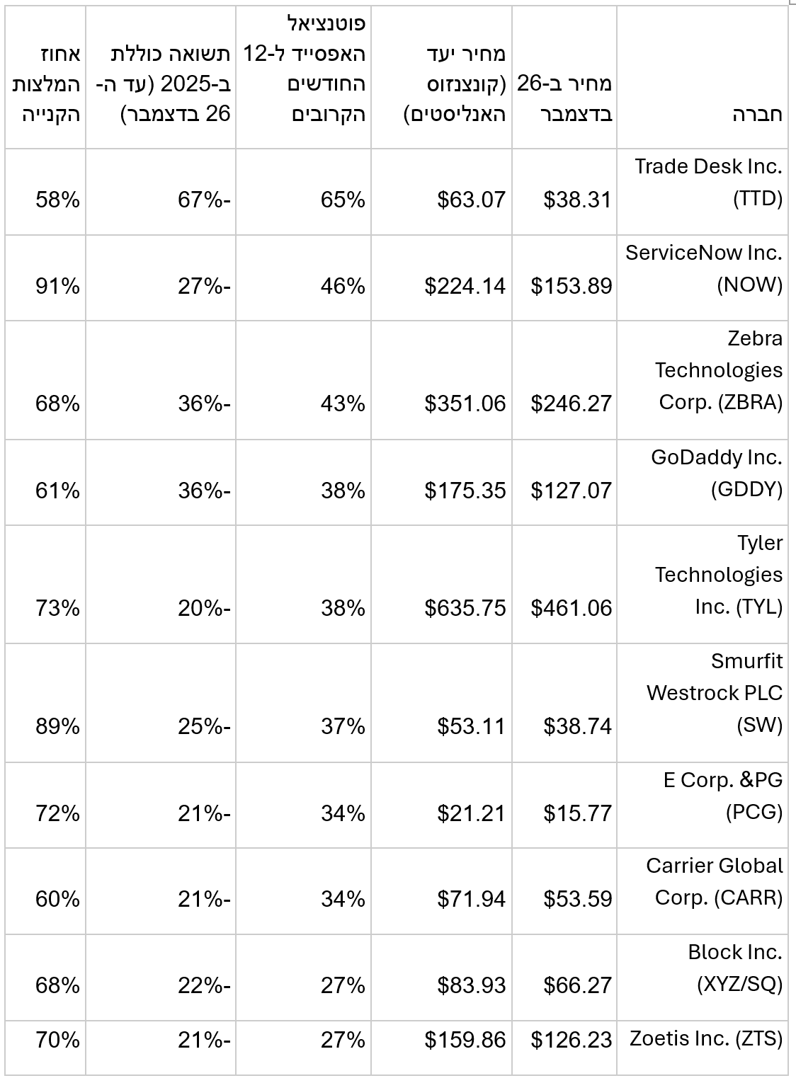 מדד ה-S&P 500 בדרך לסגור שנה חיובית שלישית ברציפות, עם עלייה של כ-17% מתחילת השנה. לקראת השנה החדשה, באתר הכלכלי מרקטוואץ' מסמנים מספר מניות במדד הדגל האמריקאי שרשמו ירידות משמעותיות במהלך השנה, אך האנליסטים צופים להן תשואות נאות - ברוב המקרים בשיעור של עשרות אחוזים - במהלך 2026.