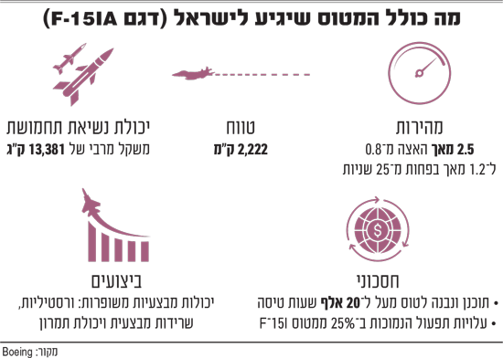 במסגרת העסקה, נמכרים 25 מטוסי 15IA־F מתוצרת בואינג תמורת כ־8.577 מיליארד דולר ואופציה לרכישת 25 יחידות נוספות. משמעות הדבר, שישראל כבר הבטיחה טייסת אחת וישנה אפשרות לטייסת שנייה - ואף יותר.
