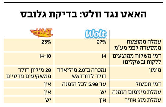 העמלה הממוצעת הנלקחת ממסעדות שעובדות עם וולט עומדת על 27% לפני מע"מ, ואילו הממוצע בהאאט עומד על 23% - כתלות בהיקף פעילות המסעדה ובסל הקנייה הממוצע. דמי המשלוח ללקוח בדרך כלל דומים: הממוצע בהאאט נע בין 14 ל־18 שקל, ובוולט הוא 14 שקל, אך שם גם קיימת מגבלה של 24 שקל. בהאאט, כאפליקציה שמשרתת גם כפרים מרוחקים, דמי המשלוח יכולים גם להגיע ליותר מ־30 שקל. בוולט גובים עמלות שונות שאינן נגבות בהאאט, כמו דמי תפעול של עד 5.9 שקלים על כל הזמנה וגם תשלום מיוחד על הזמנות קטנות שיורדות מהרף המינימלי להזמנה. בהאאט, עם זאת, גובים מהלקוח עמלה מיוחדת בגובה חמישה שקלים על משלוח במזג אוויר קשה, כפי שהיה במהלך הימים הסוערים מוקדם יותר השבוע.