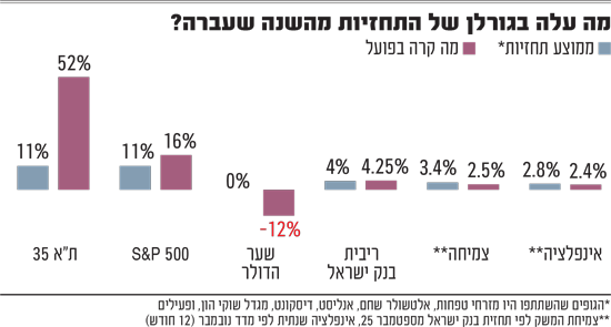 ממוצע התחזיות שנתנו מנהלי ההשקעות לשנת 2025 העריך שמדד ת"א־35 יעלה ב־11%, כשבפועל נרשמה תשואה חיובית פנטסטית של כמעט פי 5 - 52%. במדד S&P 500 ההערכה הייתה לעלייה של 11%, וכאן התשואה "ברחה" מעלה באופן מתון יחסית כשהמדד עלה כ־16%.
