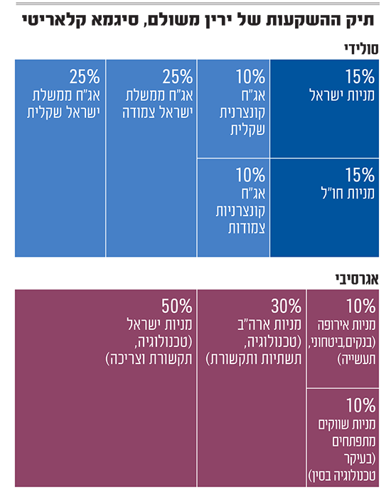 עבור המשקיע הסולידי, ממליץ משולם להתמקד בשוק המקומי, עם הקצאה של 70% מהתיק לאג"ח מקומיות. החלוקה המומלצת לטעמו היא 50% מכך באג"ח ממשלתיות (חצי שקליות וחצי צמודות), ועוד 20% בקונצרניות שקליות וצמודות (בחלוקה שווה). את יתר התיק הוא ממליץ לפזר מחצית במניות ישראליות ומחצית במניות חו"ל.