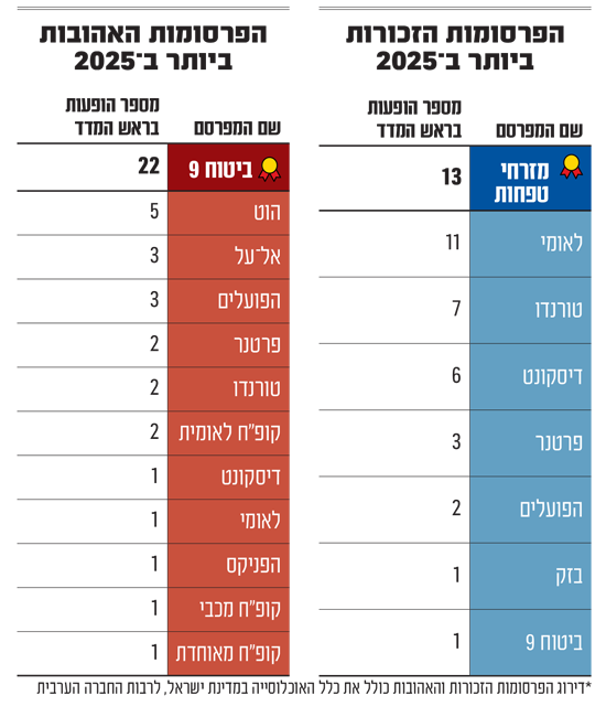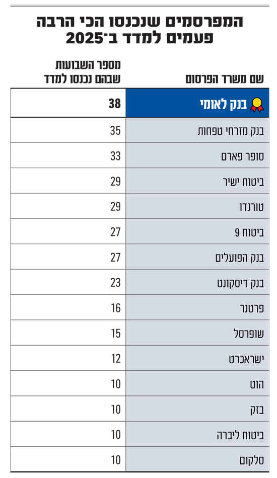 כאן אנו מציגים את סיכום הפרסומות הזכורות והאהובות ביותר של גלובס וגיאוקרטוגרפיה לשנת 2025, הן מבחינת המפרסמים והן מבחינת משרדי הפרסום. בדומה לשנים עברו, גם הפעם ענף הפיננסים "משתלט" על המדד, כאשר הבנקים וחברות הביטוח רשמו את הנוכחות הגבוהה ביותר ב-44 השבועות שבהם הוא התקיים.