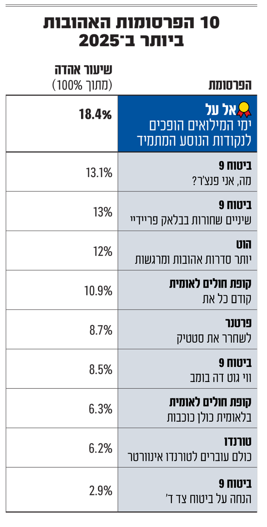 למעשה, הנתונים מצביעים על חזרתו המלאה של ענף הפרסום לפעילות, ואף על שבירת שיאים בתקציבים. לפי נתוני יפעת בקרת מדיה, ב-2025 הסתכם היקף הפרסום הכולל בטלוויזיה בכ-2.7 מיליארד שקל, וזאת לעומת 2 מיליארד שקל ב-2024. למעשה, מדובר בסכום הגבוה ביותר זה שנים. המפרסם הבולט השנה הוא פלטפורמת הסטרימינג freeTV שהשנה נפרדה ממשרד הפרסום שלה, עם תקציב של כ-48 מיליון שקל, ולאחר מכן טורנדו עם כ-37 מיליון שקל, ובנק לאומי עם כ-33 מיליון שקל.