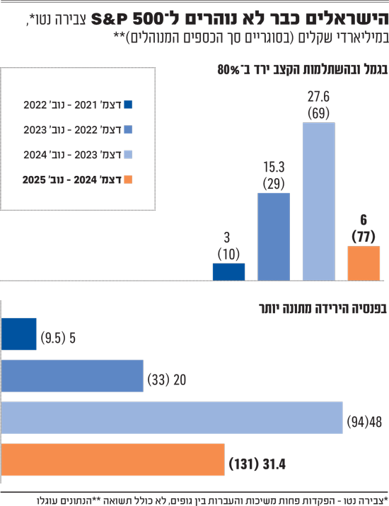 התוצאה לא מאחרת לבוא. גלובס בחן את השינוי באפיקי החיסכון לאורך שנת 2025, וההשפעה ניכרת: נפילה בכספים שזרמו למסלולים מחקי S&P 500. על פי הנתונים האחרונים שפורסמו, מאז דצמבר 2024 ועד נובמבר 2025, נרשמה במסלולים הללו "צבירה נטו" (הפקדות פחות משיכות והעברות, ללא תשואות) של 6 מיליארד שקל בלבד בגמל וההשתלמות, 80% פחות לעומת 27.6 מיליארד שקל שנצברו בהם בשנה שלפני כן. בסך הכול כ-77 מיליארד שקל בגמל ובהשתלמות עוקבים כיום אחרי המדד האמריקאי הפופולרי.