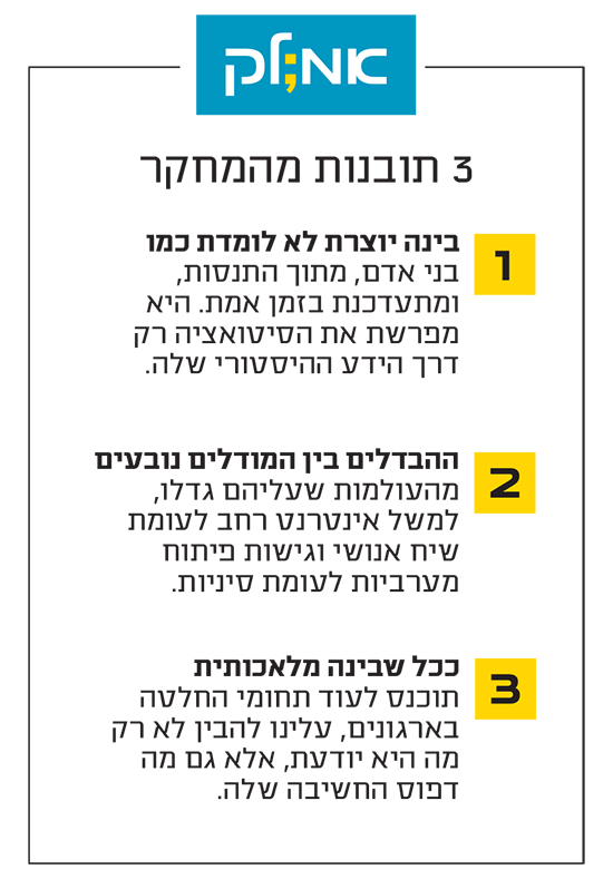 המסקנה מהניסוי הזה היא רחבה הרבה יותר משאלות שקשורות לביצועים במסחר. המודלים הגנרטיביים אינם לומדים כמו בני אדם, אינם מעדכנים את עצמם בזמן אמת ואינם מפתחים אינטואיציה חדשה מתוך התנסות. הם פשוט מיישמים, באופן עיוור ועקבי, את דפוסי החשיבה שנצרבו בהם בשנות האימון ומפרשים את הסיטואציה דרך עדשות הידע ההיסטורי שלהם בלבד. ההבדלים ביניהם אינם נובעים מהקוד שמריץ אותם, אלא מהעולמות שעליהם גדלו: אינטרנט רחב לעומת שיח אנושי, טקסטים טכניים לעומת מאגרי קוד וגישות פיתוח מערביות לעומת סיניות.