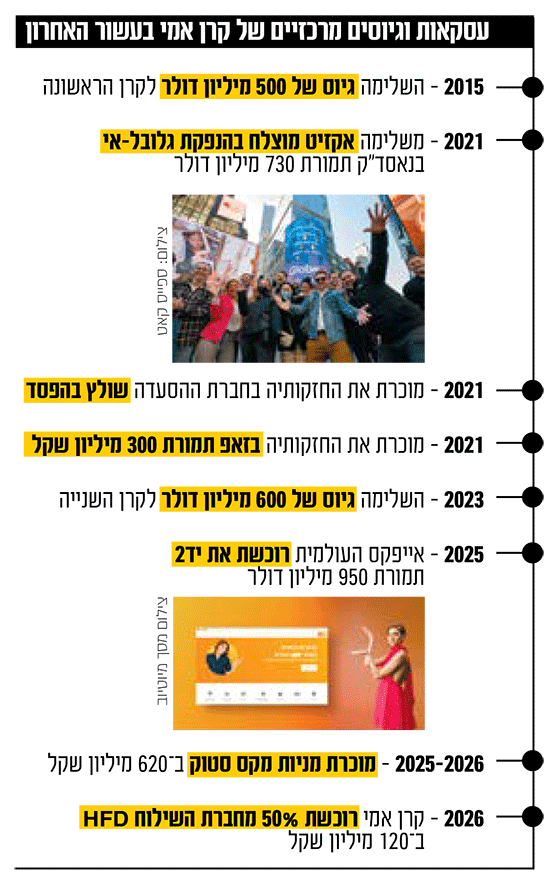 כך או כך, בעת האחרונה חזרה כאמור כהן לשוק עם שתי עסקאות משמעותיות. בחודש שעבר רכשה אייפקס העולמית את אתר המכירות האינטרנטית יד2 תמורת 3.1 מיליארד שקל (950 מיליון דולר) - העסקה הגדולה אי־פעם למכירת אתר אינטרנט בישראל. לגלובס נודע כי קרן אמי 2 לקחה חלק בהשקעה בסכום של עשרות מיליוני דולרים.