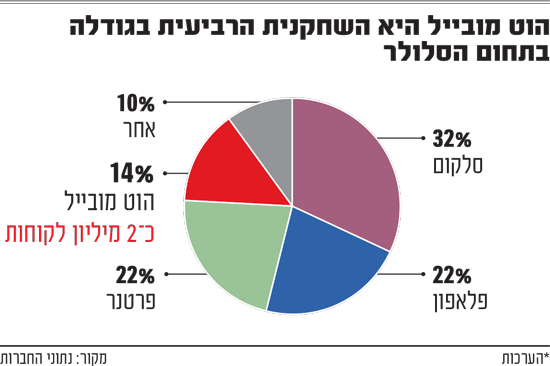 לפי הערכות, כיום סלקום מובילה את שוק הסלולר בישראל עם נתח של כ-32%, פלאפון ופרטנר עם נתח של כ-22% כל אחת, והוט מובייל מחזיקה בכ-14%-15% (היתר מוחזק על-ידי שחקנים קטנים בשוק, כדוגמת רמי לוי ו-019). לפי ההערכות, להוט מובייל יש כ-2 מיליון מנויים ומכירות של מעל 1.5 מיליארד שקל בשנה.