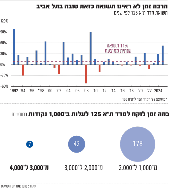 כמה זמן ייקח לת"א להגיע לנקודה ה־5,000? אי אפשר לדעת כמובן. אבל ההיסטוריה מלמדת שלפחות בינתיים הזמן שלוקח למדד לקפוץ ב־1,000 נקודות הולך ומתקצר מפעם לפעם. לרמת 1,000 נקודות הגיע מדד ת"א 125 (אז בשמו מדד ת"א 100) בשנת 2007, רגע לפני משבר הסאב־פריים הגדול בארה"ב, כשהוא יוצא מהאינתיפאדה השנייה בתחילת שנות ה־2000. אלא שהמשבר הגדול בארה"ב קטע את העליות, בלשון המעטה ומדד הדגל צלל בעשרות אחוזים.