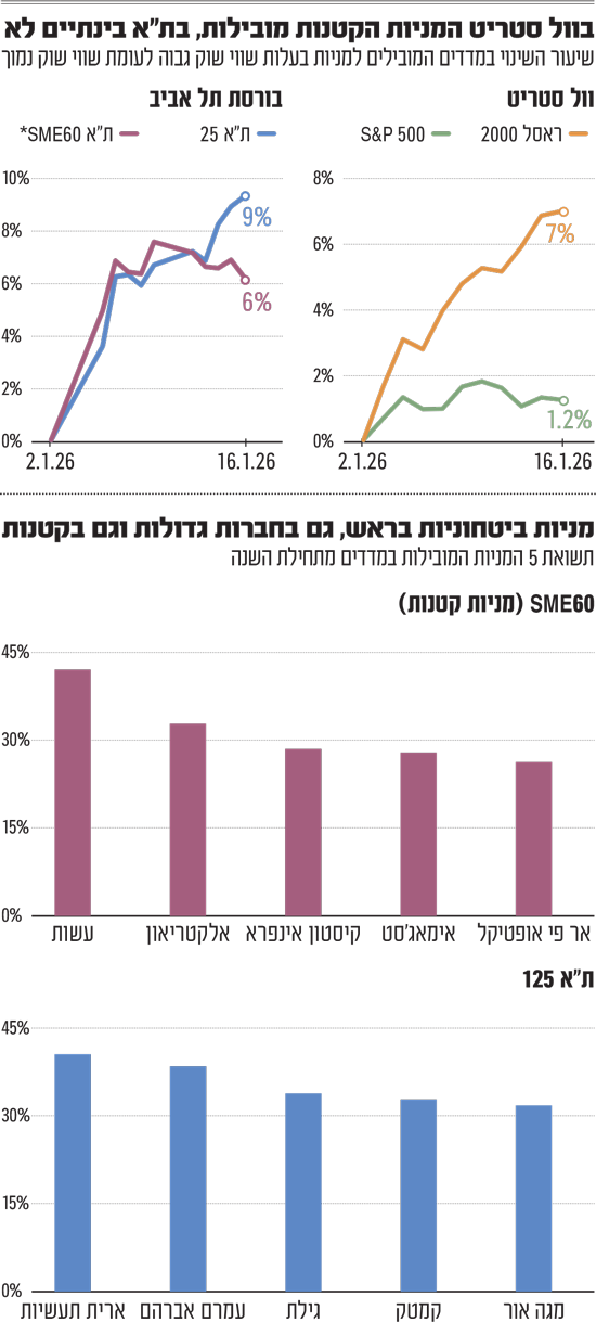 בזמן שבארה"ב מדדי המניות הבינוניות והקטנות הכו את המדדים המובילים מתחילת השנה, בארץ מדדי הגדל המשיכו לתת את הטון. כך, מאז נפתחה 2026 עלו מדד ת"א 35 ו־125, הכוללים את החברות הגדולות בשוק המקומי, בכ־9%. באותה התקופה, מדד 60 SME, הכולל את 60 המניות הגדולות בשוק שאינן נכללות במדד ת"א 125, עלה בכ־6%.