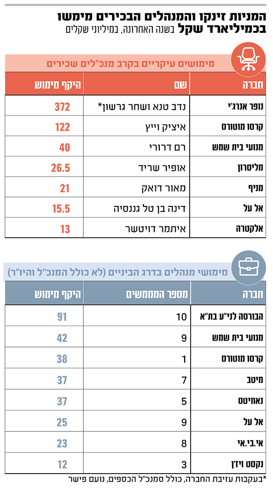 מממש בולט נוסף הוא אופיר שריד, מנכ"ל חברת המרכזים המסחריים מליסרון, שמכר בשנה החולפת מניות שקיבל עם כניסתו לתפקיד בסוף שנת 2019, תמורת כ־26.5 מיליון שקל. לצידו בלטה גם דינה בן טל גננסיה, המנכ"לית הפורשת של חברת התעופה אל על, שמכרה בשנה החולפת מניות בהיקף של כ־15.5 מיליון שקל, על רקע העליות החדות במניה.