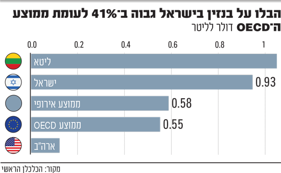 הניתוח של הכלכלן הראשי חושף כי בשנת 2024 הבלו המוטל על בנזין בישראל עמד על 0.93 דולר לליטר, נתון שמציב את ישראל במקום השני מקרב כלל מדינות ה־OECD. רק הבלו בליטא היה גבוה יותר באותה שנה עם 1.06 דולר לליטר. על פי אותם נתונים הבלו בישראל ב־2024 היה גבוה ב־41% מהממוצע של כלל מדינות ה־OECD ובכ־38% מהממוצע של 27 המדינות האירופיות.