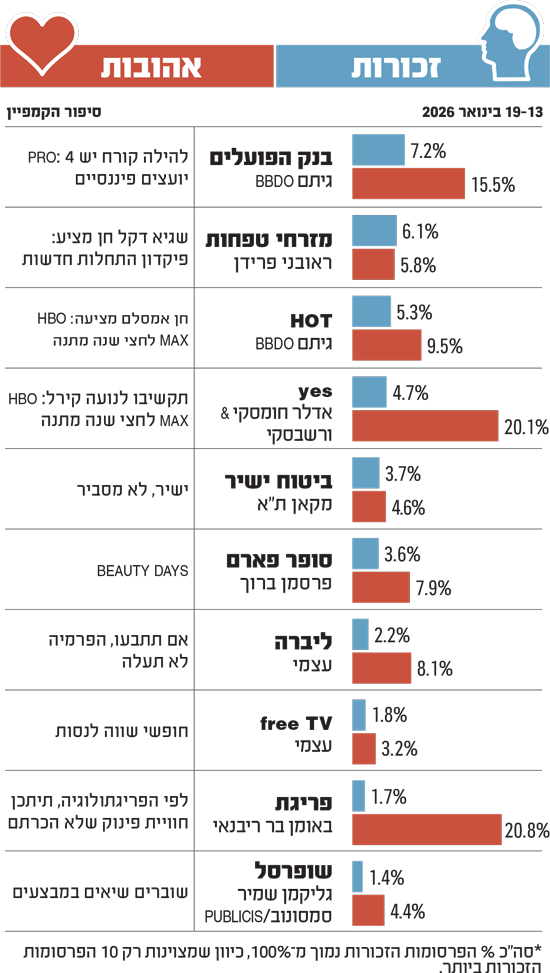 המשרדים האחראים לשלוש הפרסומות האהובות ביותר הם באומן בר ריבנאי (פריגת), אדלר חומסקי & ורשבסקי (yes) וגיתם BBDO (בנק הפועלים).