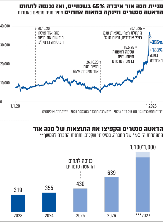 ובחזרה לתחום חוות השרתים שהקפיץ את מניית מגה אור. עד כמה העסקאות הללו משמעותיות ומסבירות את הזינוק במניית החברה ניתן לראות מכך שבמצגת לסיכום הרבעון השלישי של 2025 מגה אור סיפקה תחזית לפיה את שנת 2025 תסיים עם NOI שנתי (ההכנסה התפעולית נטו, מעין רווח גולמי) של 430 מיליון שקל, עדיין כמעט ללא הכנסות מדאטה סנטרים, ואילו בסוף שנת 2026 ה־NOI יזנק ל־639 מיליון שקל, כולל דאטה סנטרים.