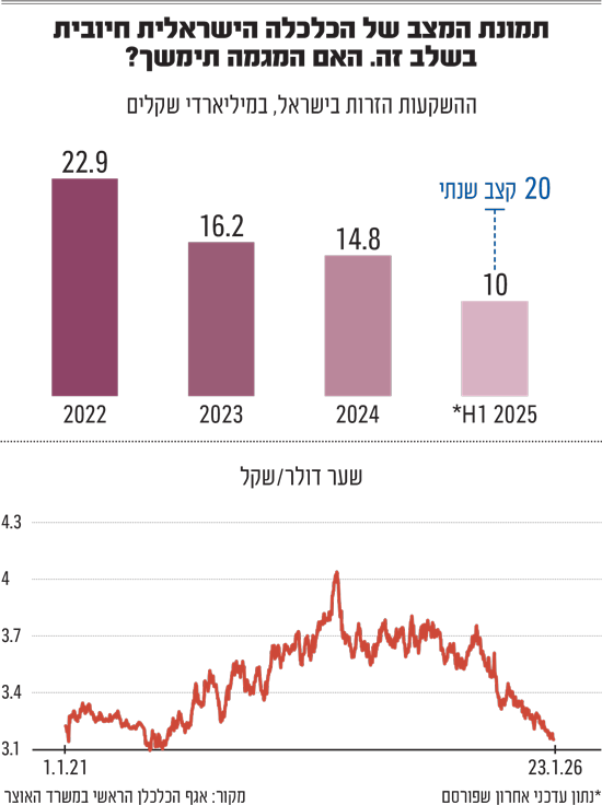 ויש גם תרחיש שבו המערכה מול איראן מסתבכת. לדעת מנחם, מלחמה ארוכה מול איראן והפרוקסי שלה - שתכלול פגיעה בתוצר, המשך פעילות של החות'ים ואולי ארה"ב תשקול מחדש את צעדיה באזור - היא התרחיש השלילי ביותר שעלול להביא לפיחות של השקל מול הדולר.