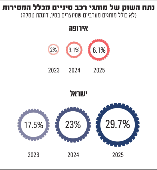 גם נתח השוק הכולל של הסיניים באירופה כמעט הוכפל ב-2025, אם כי הוא עדיין עמד על כ-6.1% בלבד, לעומת כ-32% בישראל באותה שנה. אבל צריך לזכור, שבניגוד לישראל, לאירופה יש תעשיית רכב, שמספקת תעסוקה והכנסות משמעותיות למדינות שבהן היא פועלת, ולכן נהנית מנאמנות "פטריוטית" של הלקוחות המקומיים.