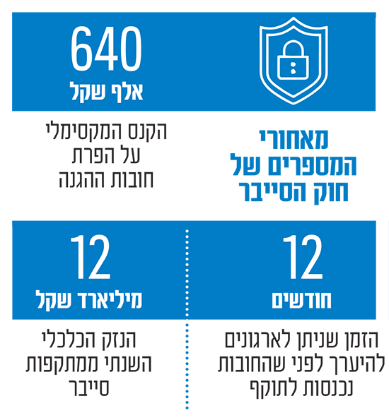 החקיקה החדשה כוללת מנגנוני אכיפה משמעותיים. מערך הסייבר יוכל להטיל עיצומים של עד 640 אלף שקל על הפרת דרישות הגנה, ועד 300 אלף שקל על אי־דיווח או אי־ציות בעת תקיפה. במקרה של תקיפה חמורה, אי־ציות להוראות בלימה עלול להוביל לאחריות פלילית, עונש מאסר של עד שנתיים וקנסות אישיים על נושאי משרה.