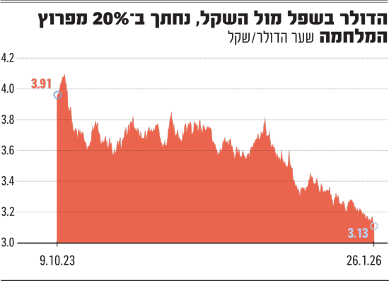 הדולר נסחר ברמות שפל שלא נראו זה כארבע שנים. בצהרי יום שלישי הגיע לשער של 3.109 שקלים - ירידה של כ־1% ביחס לשער היציג הקודם. מתחילת השנה נחלש הדולר בכ־2%, ובשלוש השנים האחרונות איבד כ־10% מול השקל. ביחס לשיא שנרשם באוקטובר 2023, עם פרוץ המלחמה (4.05 שקלים לדולר), מדובר בירידה מצטברת של כ־23%.