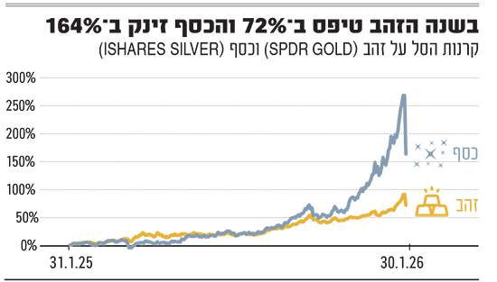 האם הירידות החדות מלמדות על סופה של בועת מחירים שהתנפחה בזהב ובכסף, או תיקון זמני בלבד? סטפק מאמין גדול בזהב וטוען כי מה שראינו בסוף השבוע היה "תגובת נגד לנסיקה המסחררת במחירי שתי המתכות הללו בחודש האחרון". נציין כי עד לנפילה ביום ו', מחיר הכסף הספיק לזנק בינואר ב־60% והזהב ב־27%, כשזה עצמו מגיע זינוק מרשים לא פחות של כ־150% בכסף ו־65% בזהב בשנת 2025.