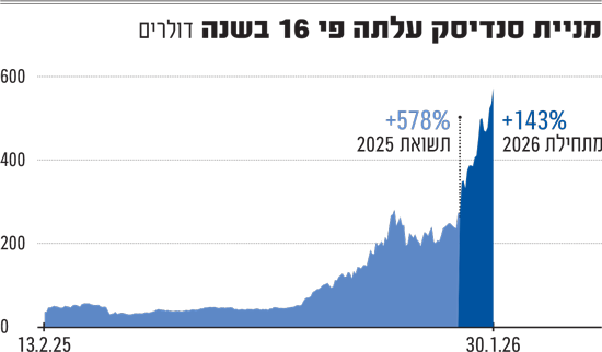 החודש תעבור שנה מאז שמניית סנדיסק חזרה למסחר בנאסד"ק. בפברואר 2025 הושלם הפיצול של סנדיסק מחברת ווסטרן דיגיטל, שרכשה אותה 9 שנים קודם לכן, וסנדיסק החלה להיסחר לפי שווי של כ־7 מיליארד דולר (כ־35 דולר למניה). שנה אחרי, שוויה של סנדיסק מגיע לשיא של מעל 85 מיליארד דולר. זאת אחרי שהמניה הייתה אשתקד בעלת התשואה הטובה ביותר במדד S&P 500 (אליו הצטרפה רק לקראת סוף השנה הקודמת), ולא עצרה גם ב־2026. מתחילת השנה הנוכחית זינקה מניית סנדיסק ב־143%. בסך הכול, מי שרכש מניה ביום המסחר הראשון נהנה מתשואה של יותר מפי 16 על ההשקעה (1,500%).