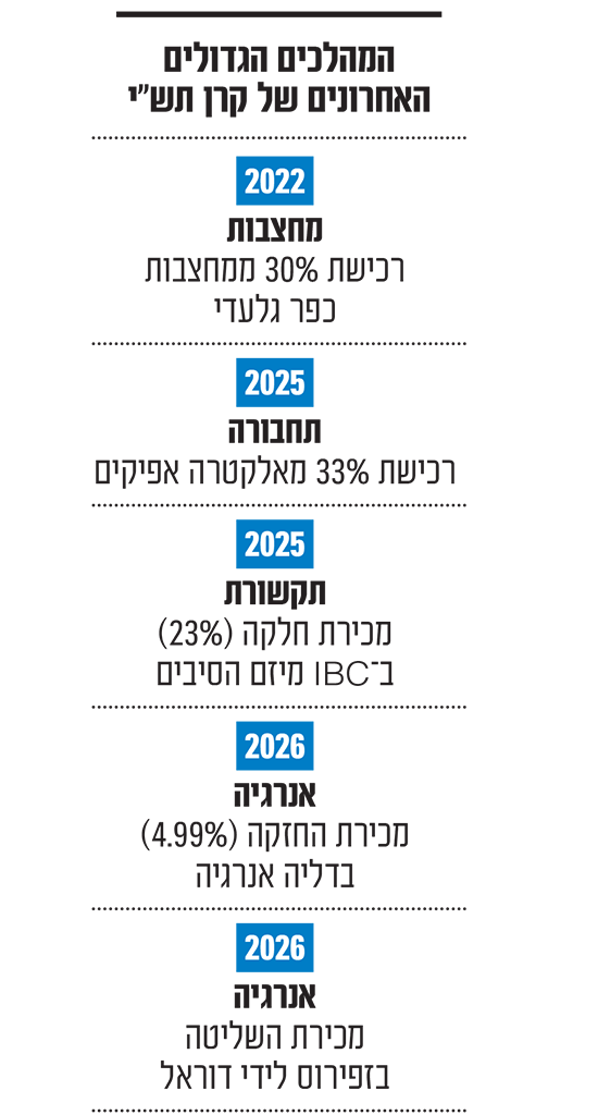 לצד אלו, רשמה לאחרונה הקרן אקזיט משמעותי נוסף במיזם הסיבים (IBC), חברת תשתיות הסיבים הגדולה בארץ. תש"י נכנסה להשקעה במיזם בשנת 2019, ומכרה בנובמבר האחרון את חלקה (23%) תמורת 506 מיליון שקל. הרווח המשוער לתש"י מהשקעתה זו הסתכם ב-360 מיליון שקל.