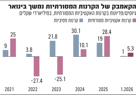 בשנה החולפת חל מפנה, כשלראשונה מאז 2021 התעשייה האקטיבית גייסה יותר כסף מזו הפסיבית (28.4 מיליארד שקל לעומת 19.8 מיליארד שקל, בהתאמה). מגמה זו נמשכה אל תוך שנת 2026, כשבחודש ינואר גייסו הקרנות המסורתיות כ-5.25 מיליארד שקל, שיא גיוס לקרנות המסורתיות של עשור לפחות - כך עולה מסקירה שפרסם נאור כהן, מנהל קשרי יועצים במיטב בית השקעות.