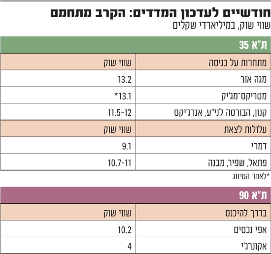 תיתכן גם אפשרות נוספת - ששתי המניות יעלו למדד, אם כל אחת מהן תצליח לצבור בחודשיים הקרובים שווי שוק נוסף של כמיליארד שקל (ללא תזוזה במניות שמעליהן, חברת המזון שטראוס של משפחת שטראוס וחברת חיפושי הנפט נאוויטס של גדעון תדמור).