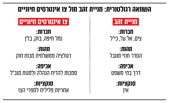 לעומת זאת, "צו אינטרסים חיוניים" - שהוחל על גופים שהופרטו בשנים מאוחרות יותר, כדוגמת נמל חיפה - מהווה כלי רגולטורי עוצמתי בהרבה. הצו מעניק לשרים סמכויות רחבות ומיידיות, ומטיל אחריות פלילית על הפרתו. בתרחיש של פגיעה באינטרס הלאומי, הצו אף מאפשר למדינה "להשתלט" דה־פקטו על ניהול החברה ולמנות מנכ"ל מטעמה, צעד שמשנה לחלוטין את מאזן הכוחות מול הרוכש הפוטנציאלי.