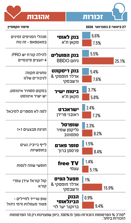 המדור, המתפרסם כאן מדי שבוע ב־20 השנים האחרונות, מתבסס על דירוג של חברת גיאוקרטוגרפיה ושם דגש על ניתוח מגמות ושינויים, קריאיטיב ייחודי, צעדים משלימים בדיגיטל ועוד. דירוג הפרסומות הזכורות והאהובות כולל את כלל האוכלוסייה במדינת ישראל לרבות החברה הערבית.
