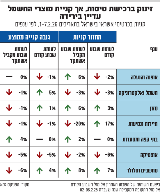 במקביל, בענף החשמל והאלקטרוניקה נרשמה השבוע ירידה של 3% במחזור הקניות. מדובר בהתמתנות יחסית לאחר חודשי נובמבר ודצמבר, שהתאפיינו במבצעי סוף שנה אגרסיביים. בחינה של נתוני חודש ינואר בהשוואה לתקופה המקבילה אשתקד מציגה עלייה של 4% במחזור הקניות בענף. העלייה נבעה מגידול של 6% בכמות העסקאות.