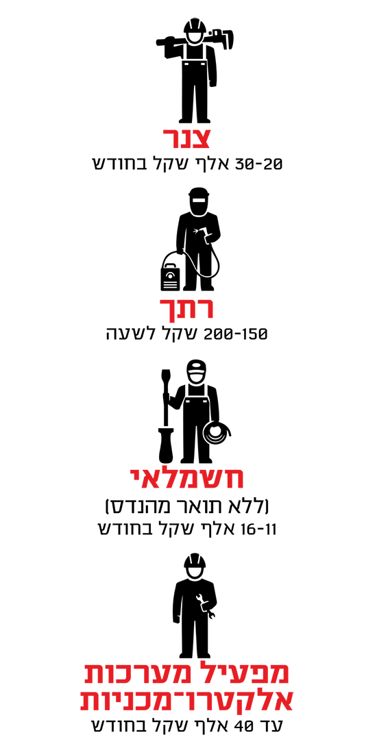 מבדיקת גלובס עולה כי משכורתיהם של עובדי הכפיים בעידן הזה יכולות להשתוות לעתים למשכורות הייטק, גם ללא תואר אקדמי. צנרים, למשל, יכולים להגיע לשכר של 30-20 אלף שקל בחודש. רתכים שקיבלו 130 שקל לשעה לפני עשור מקבלים כיום 200-150 שקל לשעה. חשמלאי ללא תואר מהנדס מתחיל אמנם בשכר של 11 אלף שקל, אך עם ותק של כמה שנים יכול לטפס ל־15-16 אלף שקל. מפעילי מערכות אלקטרו־מכניות יכולים לקבל על פי הערכה 250 שקל לשעה, ומשכורותיהם עשויות להאמיר ל־40 אלף שקל בחודש.