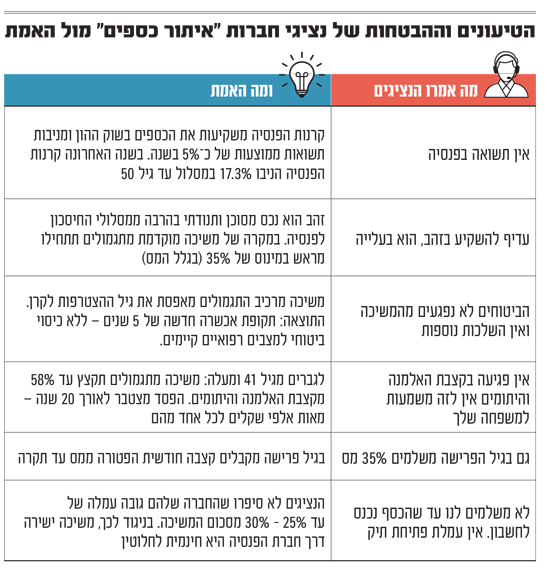 הטיעון המדהים ביותר חזר בשלוש שיחות שונות. לדברי הנציגים, קרנות הפנסיה לא מייצרות תשואה לחוסכים. הטענה הזו כמובן קלה להפרכה - בכל חודש מתפרסמות התשואות של קרנות הפנסיה. רק בשנה האחרונה הקרנות במסלול הפופולרי, עד גיל 50, סיפקו תשואה יוצאת דופן של 17.3% בממוצע (לעומת כ־5% בשנה רגילה), ובמהלך חמש השנים האחרונות הניבו 63%.
