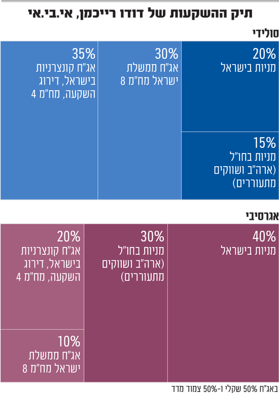 בהתאם לכך, רייכמן מרכיב תיק שהחלק המנייתי שבו מוטה לישראל. למשקיע סולידי הוא מציע להחזיק 20% במניות בישראל ו־15% במניות בחו"ל - בארה"ב וגם בשווקים מתעוררים כמו טייוואן, קוריאה וסין. עוד 35% הוא מקצה לאג"ח קונצרניות מקומיות בדירוג השקעה עם מח"מ (משך חיים ממוצע) של 4 שנים, ו־30% לאג"ח ממשלת ישראל במח"מ 7-8.
